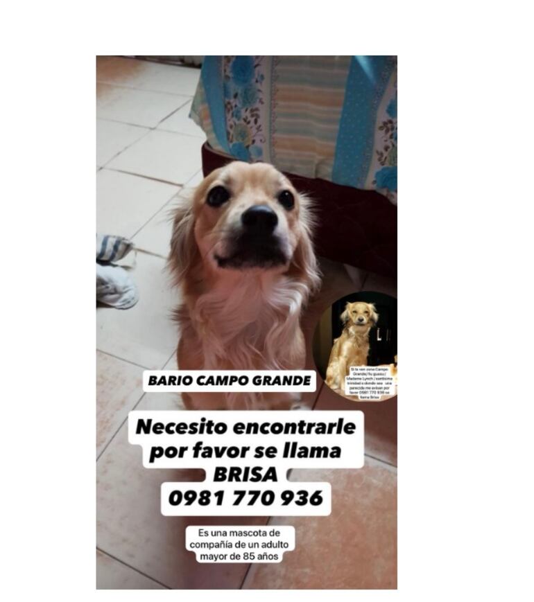 En el barrio Campo Grande se encuentra en marcha la búsqueda de Brisa, una perrita mestiza de tamaño pequeño a mediano, de color dorado claro, con el pecho y parte del hocico blancos. Es de carácter dócil y muy querida por su familia, especialmente porque brinda compañía a un adulto mayor de más de 85 años, por lo que su pronta aparición es de vital importancia.