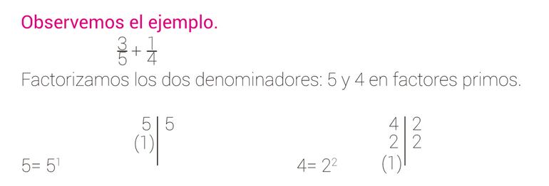 Hallamos el mínimo común múltiplo (mcm) de 5 y 4. Sabemos que el mcm, una vez hecha la factorización, son los factores comunes y no comunes elevados al máximo exponente. En el ejemplo dado es: