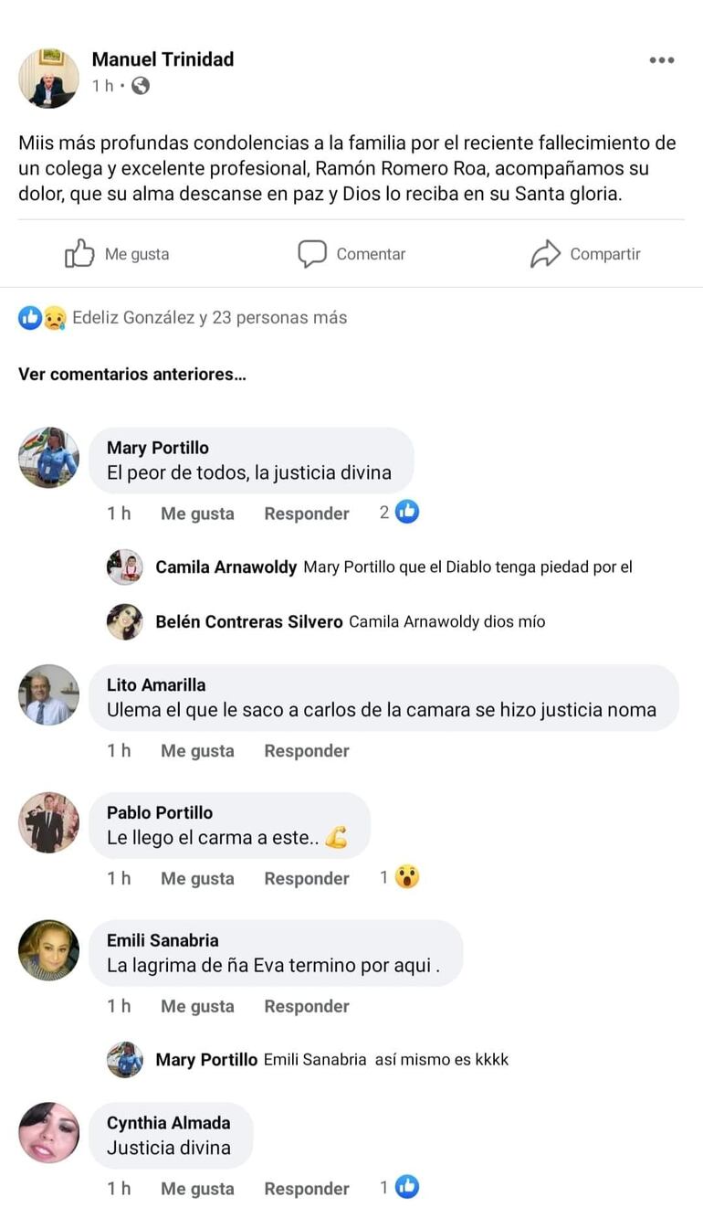 “El peor de todos, la justicia divina”, escribió la edil quien busca el rekutu en las próximas elecciones municipales. “Le llego el carma a este.. (sic)”, publicó por su parte el funcionario judicial Pablo Portillo Verón, hermano del diputado destituido por tráfico de influencia.