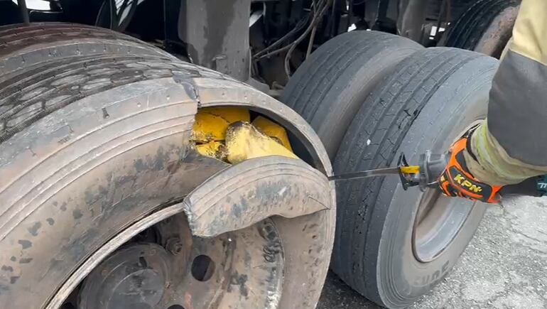 Posteriormente, con apoyo del Cuerpo de Bomberos, se procedió al desmontaje de varios neumáticos del camión y del semirremolque, lo que permitió hallar una importante carga de marihuana oculta en su interior.