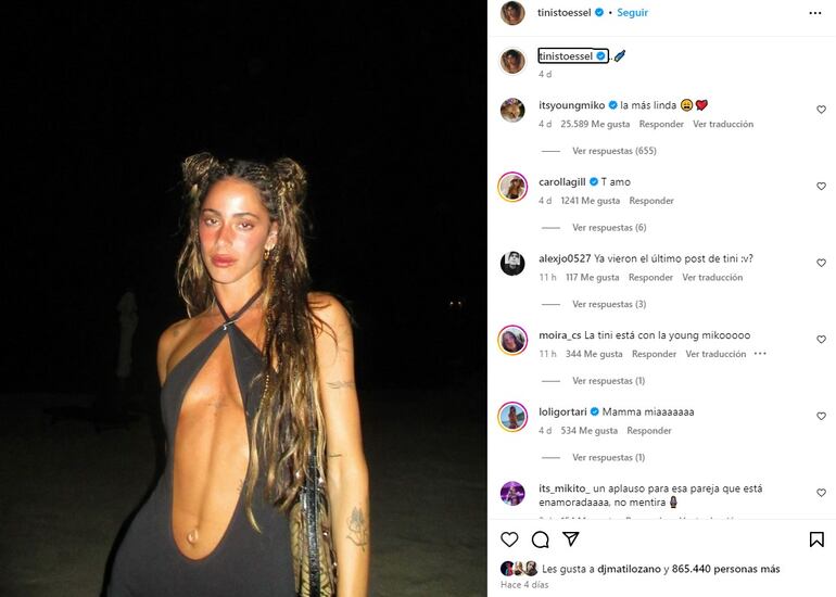 Días antes, ambas cantantes intercambiaron mensajes en Instagram, alimentando aún más las especulaciones. Tini compartió una foto en un enterito negro y recibió un comentario de Young Miko que decía: “La más linda”, con un emoji de corazón. Tini respondió con picardía, evidenciando que estaban juntas: “La que me sacó la foto es la más linda”.