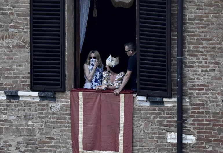 La artista estadounidense Madonna asistió evento desde el Palazzo Pannocchieschi d’Elci, una de las residencias nobiliarias más antiguas de Siena, con vistas privilegiadas a la “mossa”, la línea de salida de la competición de caballos.