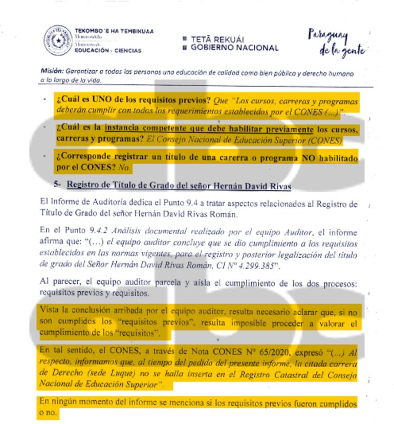 Casañas Levi, en su informe, resalta la importancia del cumplimiento de esos requisitos citados, que en realidad no fueron analizados por el equipo auditor encargado de analizar su investigación sobre la legalidad de los títulos de la Universidad Sudamericana. “Es un paso indispensable para avanzar a la etapa de valoración respecto del cumplimiento de los requisitos”, indica el informe.