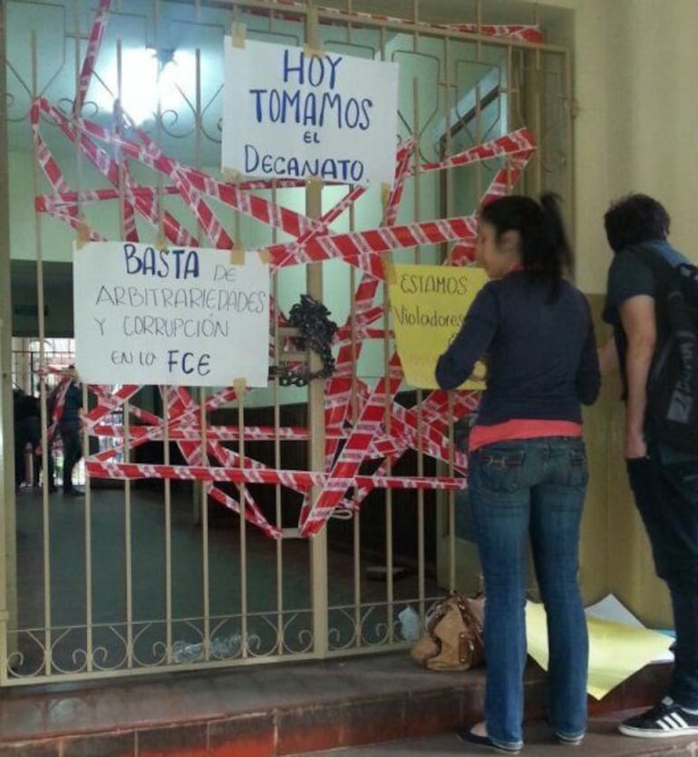 José Morales, de la Facultad de Ciencias Económicas, dijo en contacto con ABC Cardinal que la toma del decanato continuará hasta que renuncien los miembros del Consejo Directivo, ya que aseguran que varios de ellos son los mismos que formaban parte de una rosca corrupta que fue sacada con el movimiento "UNA No Te Calles", el año pasado.