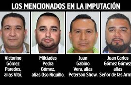 Victorino Gómez Paredes, alias Vitó; Milciades Pedra Gómez, alias Oso Riquillo; Juan Gabino Vera, alias Peterson Show, y Juan Carlos Gómez Gómez,  alias Señor de las Armas, quienes estaban farreando en el Ja'umina Fest con el ahora fallecido Marcos Ignacio Rojas Mora, alias Marcos Capital.