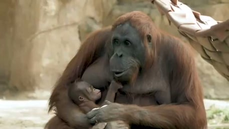 Zoológico de Madrid, un orangután de Borneo, especie en peligro de extinción, con su madre. Por AFP.